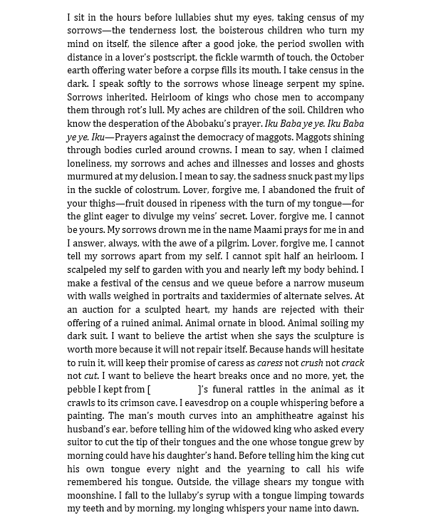 Ọbáfẹ́mi Thanni is a poet whose works of poetry and fiction have received Pushcart Prize nominations. An alumnus of the Johannesburg Institute for Advanced Study’s Writers’ Workshop, he spends his time between the cities of Ibadan and Lucille, making attempts at beauty.